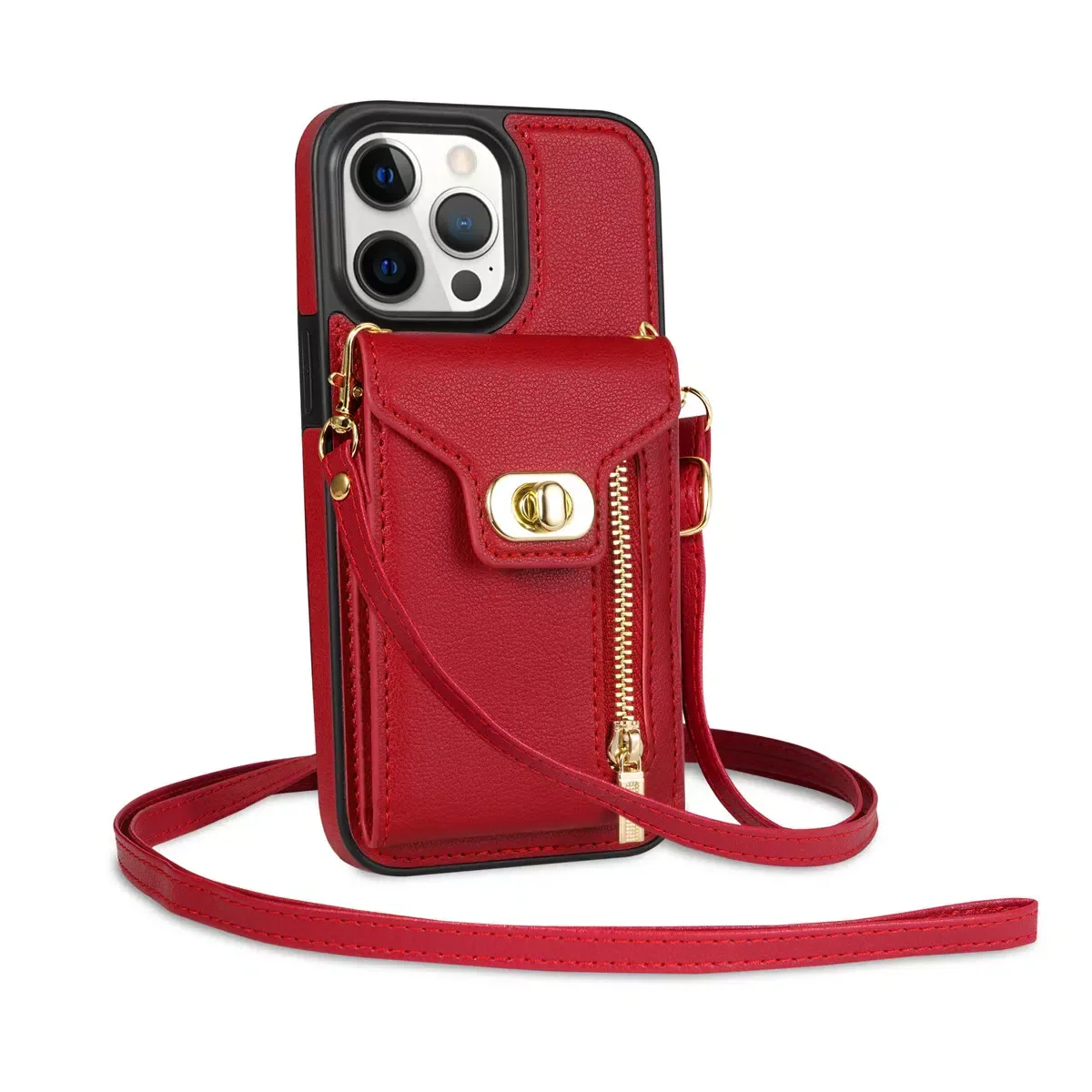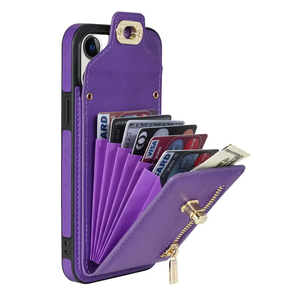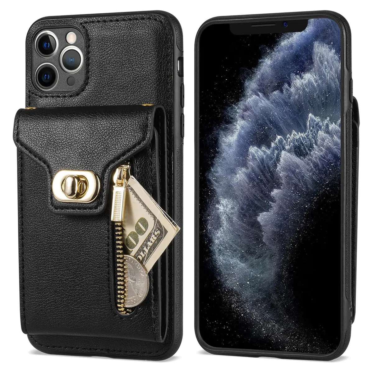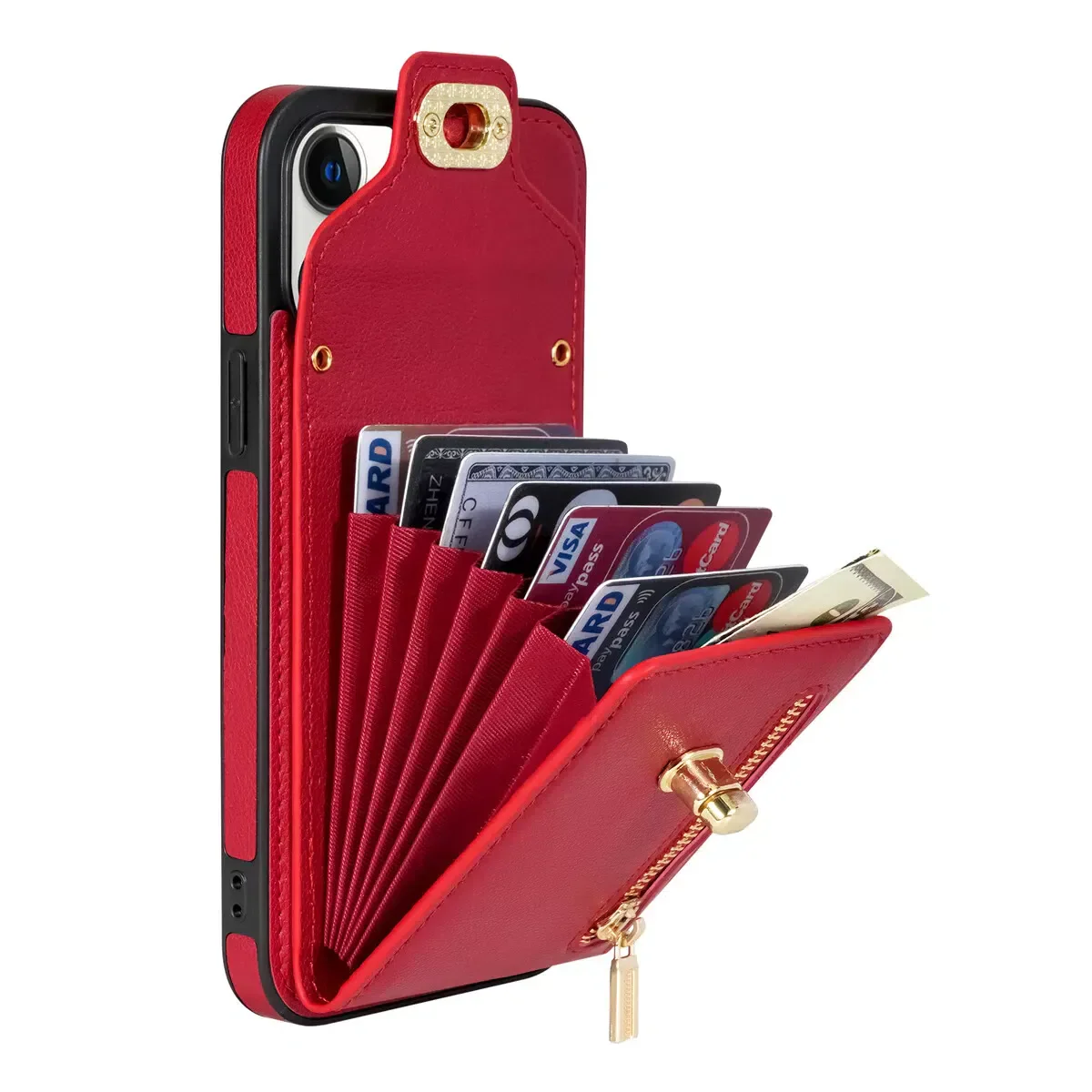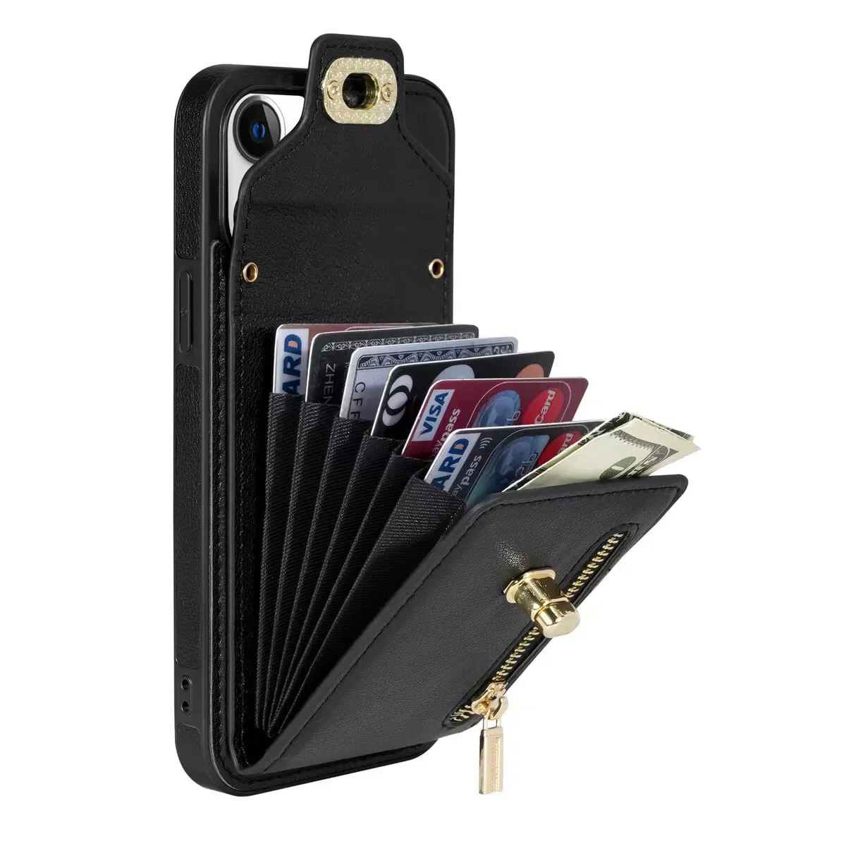Hqcasing Detachable Lanyard Leather Case Wallet Case Card Slot Shockproof Kickstand Zipper Closure Flip Leather Case for iPhone