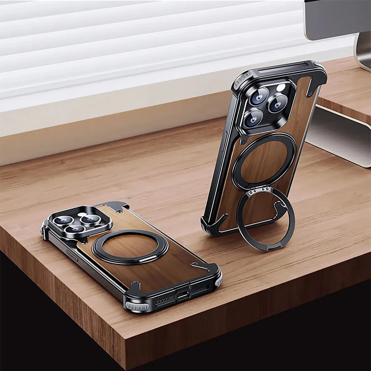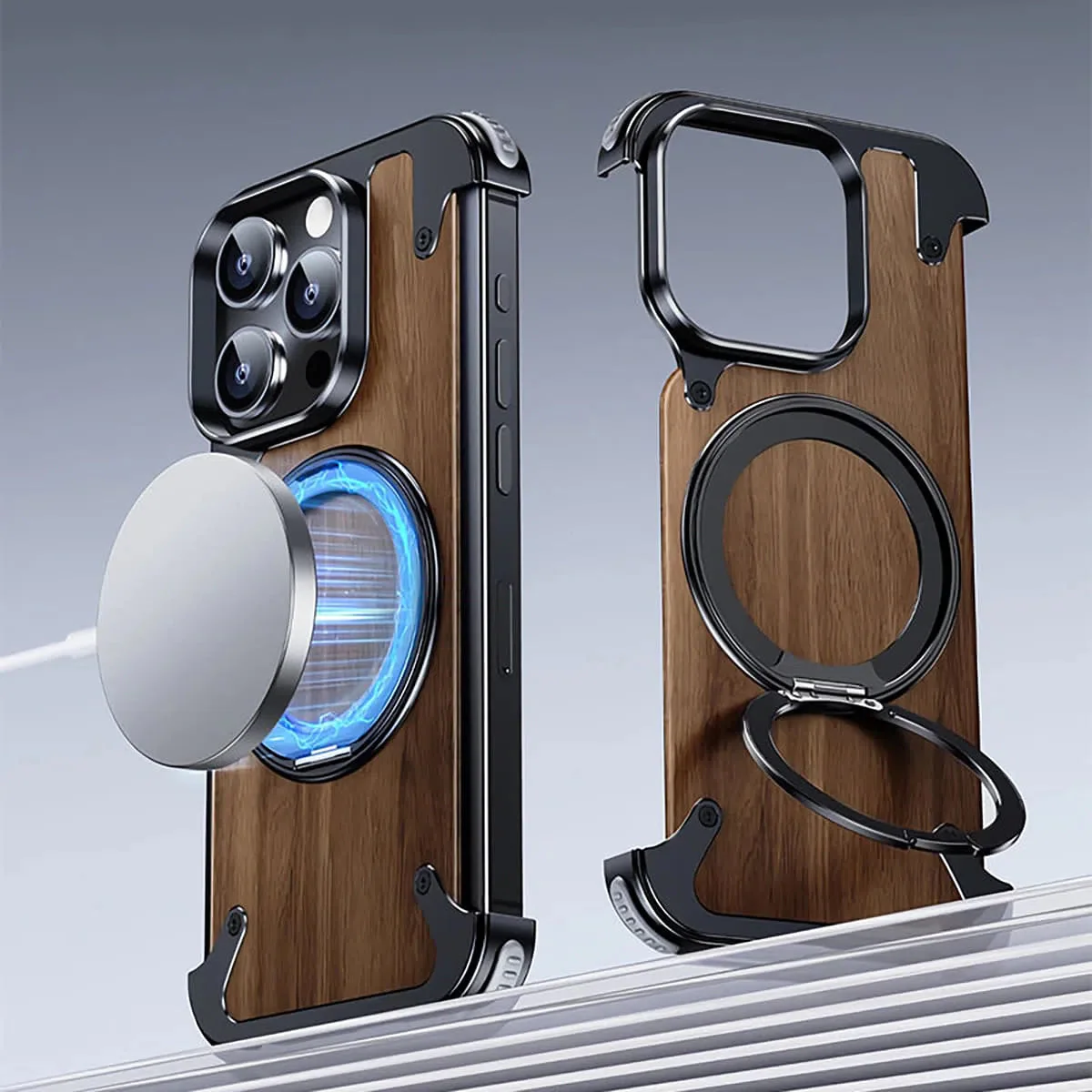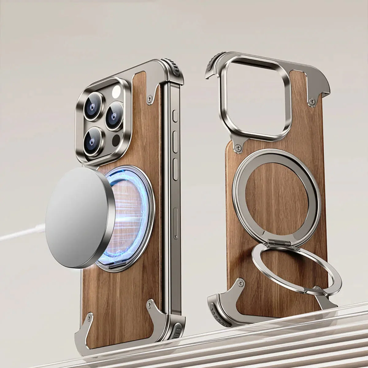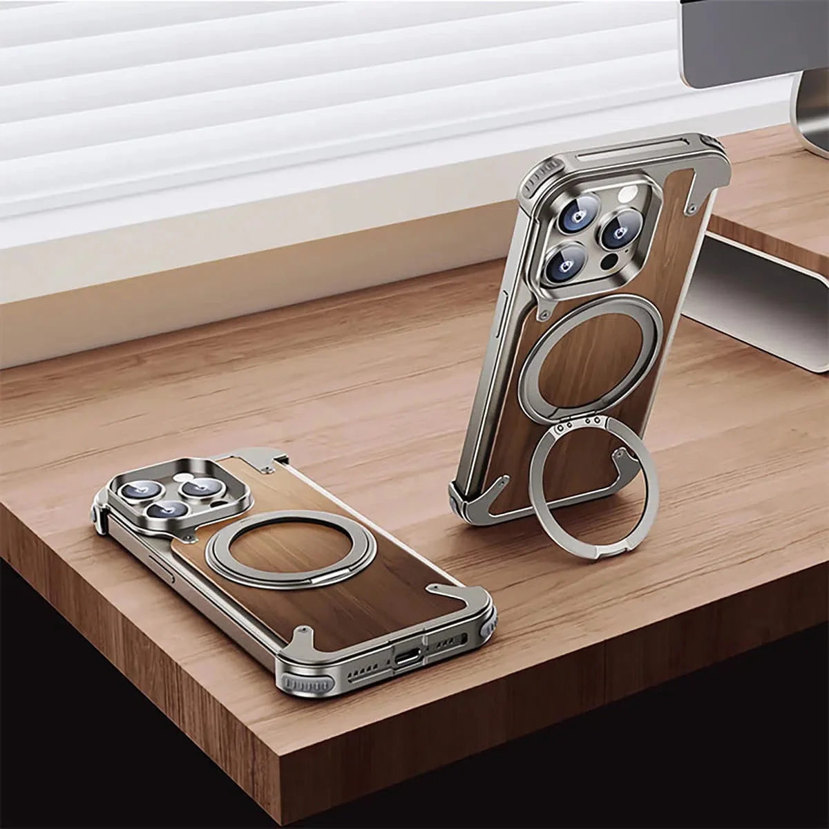 Caseles Magnetic Wood Case Compatible with iPhone, Natural Wood & Aluminum Shockproof Protective Cover Unique Wooden Case with 360° Ring Stand, Natural Titanium